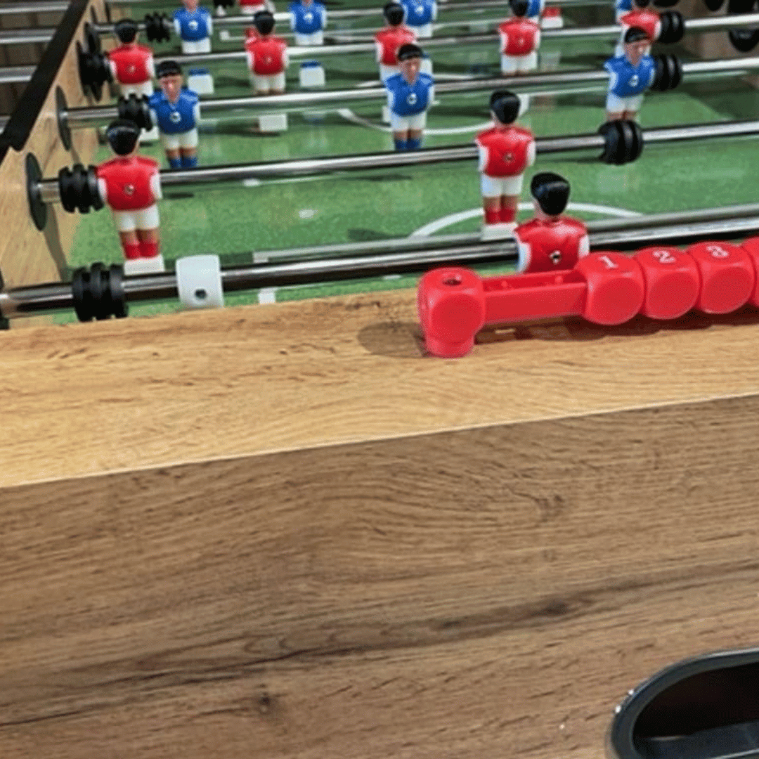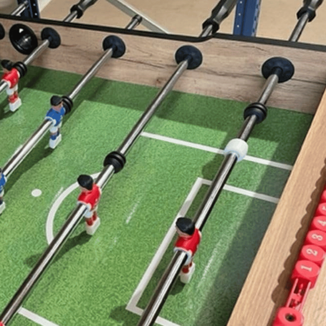 Il campo da gioco misura 117 x 68 cm, offrendo ampie superfici per manovre tattiche e azioni spettacolari che coinvolgeranno da 2 a 4 giocatori contemporaneamente, perfetto quindi sia per sfide uno contro uno che per avvincenti partite in doppio. Le aste passanti con diametro di 16 mm scorrono fluidamente grazie ai paraurti in gomma che assorbono gli impatti e riducono significativamente il rumore durante il gioco, un dettaglio fondamentale quando si noleggia il calcio balilla per eventi in ambienti chiusi o in contesti dove è richiesta una certa discrezione acustica. I manici ergonomici rivestiti in gomma garantiscono una presa salda e confortevole anche durante sessioni di gioco prolungate, evitando fastidiosi scivolamenti e permettendo ai giocatori di esprimere al meglio le proprie abilità.