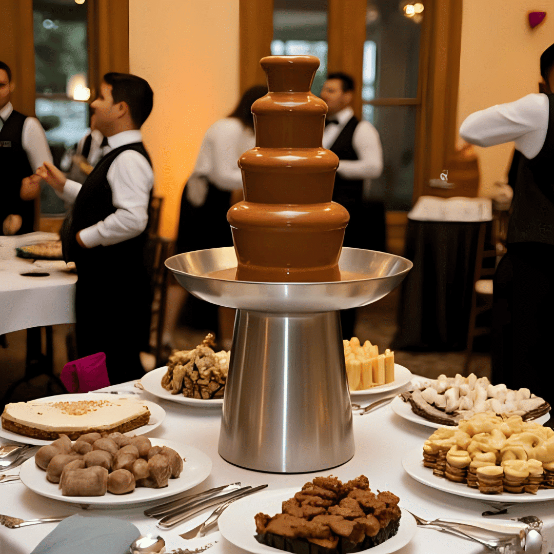 La fontana di cioccolato si rivela una scelta eccellente per una vasta gamma di eventi e celebrazioni, dalla più intima festa di compleanno alla più elaborata cerimonia nuziale, passando per eventi aziendali e fiere gastronomiche. La sua versatilità si esprime non solo nella facilità di utilizzo, grazie all’alimentazione elettrica monofase Schuko 220 V e al basso consumo di soli 100 W, ma anche nella capacità di adattarsi a diverse esigenze di allestimento e tematiche. Il flusso continuo di cioccolato crea un’attrattiva visiva e olfattiva irresistibile, invitando gli ospiti a un’esperienza sensoriale unica che combina il piacere della vista, del profumo e del gusto in un unico, indimenticabile momento. La possibilità di personalizzare l’esperienza con diversi tipi di cioccolato e una varietà di accompagnamenti, dalla frutta fresca ai dolci, rende questa fontana un elemento di spicco capace di elevare qualsiasi evento a un livello superiore di raffinatezza e divertimento.