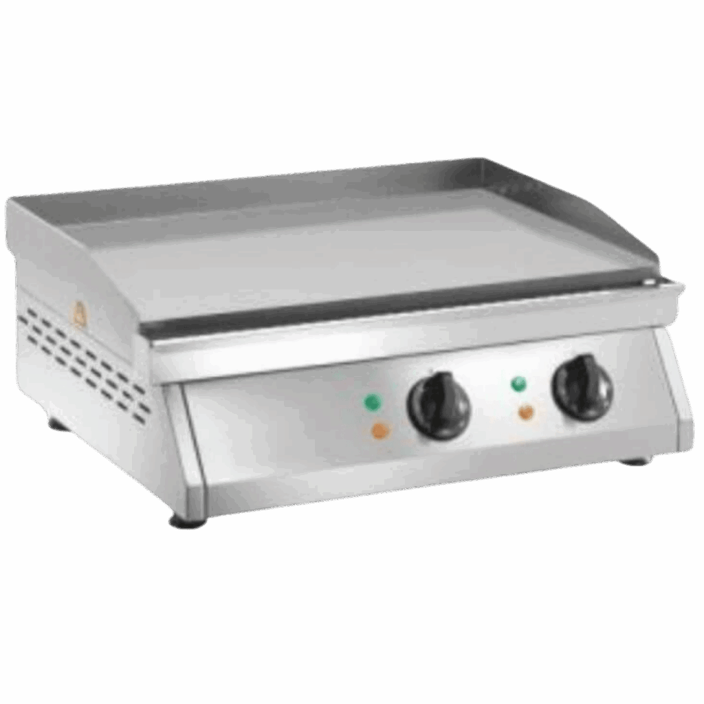 Le dimensioni compatte di questo Fry Top elettrico (L 62 cm – P 50 cm – H 40 cm) lo rendono ideale per spazi di lavoro limitati, senza compromettere la sua capacità produttiva. Con un peso di 30 Kg, offre un equilibrio ottimale tra robustezza e maneggevolezza, facilitando le operazioni di spostamento e posizionamento. L’alimentazione elettrica monofase Schuko 220 V, con un consumo di 3200 W per piastra, garantisce prestazioni elevate e costanti, adattandosi perfettamente a diverse esigenze di cottura. Un aspetto particolarmente apprezzato è il sistema di scarico integrato che convoglia grasso e residui in un cassettino removibile situato alla base, semplificando notevolmente le operazioni di pulizia e manutenzione e contribuendo a mantenere l’area di lavoro pulita e organizzata.