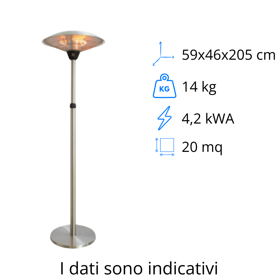Realizzata in robusto metallo, la lampada riscaldante alogena a ombrello combina durabilità e performance elevate. Con un’alimentazione a 220 V, si integra facilmente in qualsiasi contesto senza richiedere installazioni complesse. Le sue dimensioni compatte (L 59 cm x P 46 cm x H 205 cm) e il peso contenuto di 14 kg la rendono facilmente trasportabile e posizionabile, ideale per chi cerca una soluzione di riscaldamento flessibile e efficiente. Il servizio di noleggio offre numerosi vantaggi, tra cui la possibilità di disporre di attrezzature sempre in perfetto stato senza preoccuparsi della manutenzione, la flessibilità di utilizzo in base alle proprie esigenze temporanee, e l’opportunità di testare l’efficacia del prodotto prima di un eventuale acquisto.