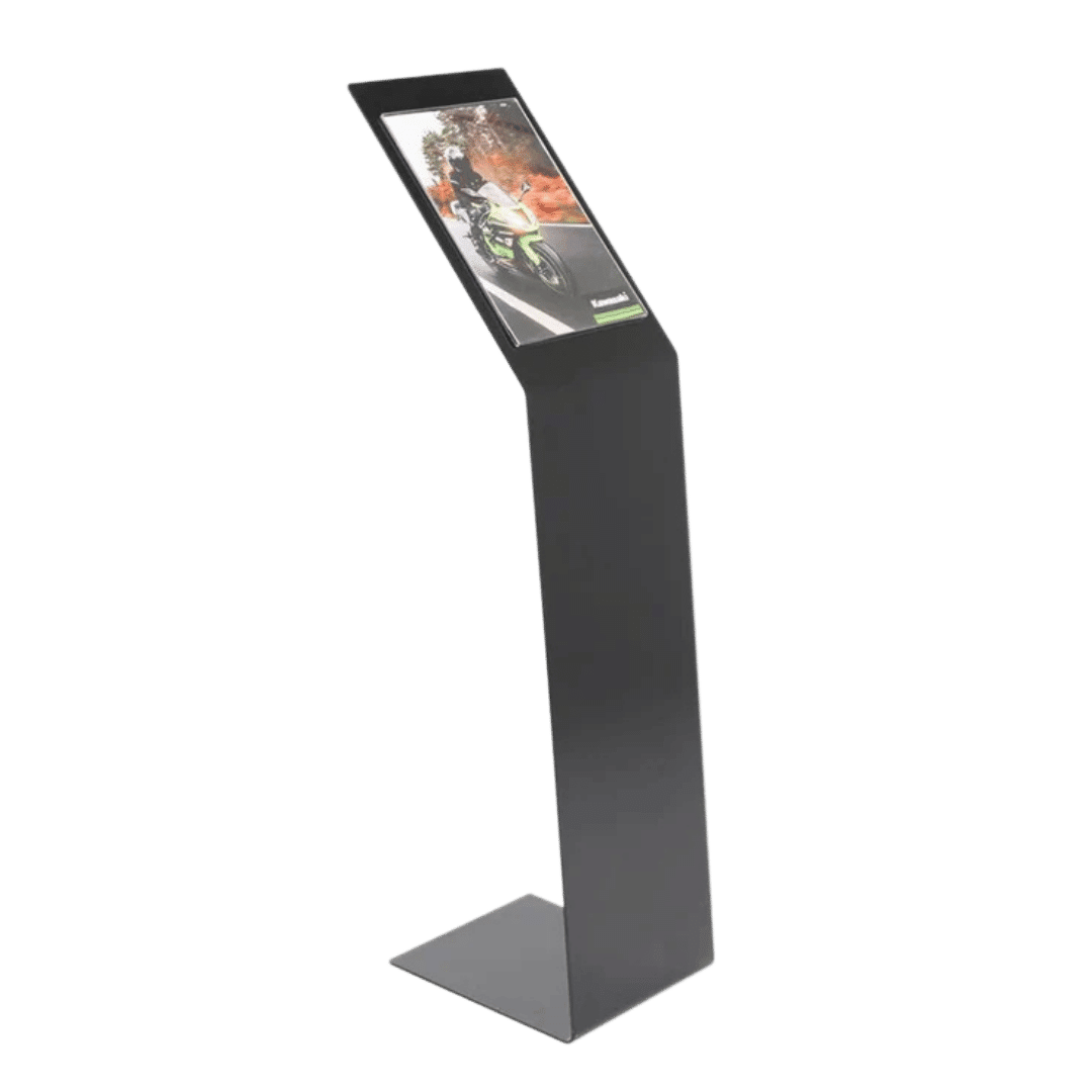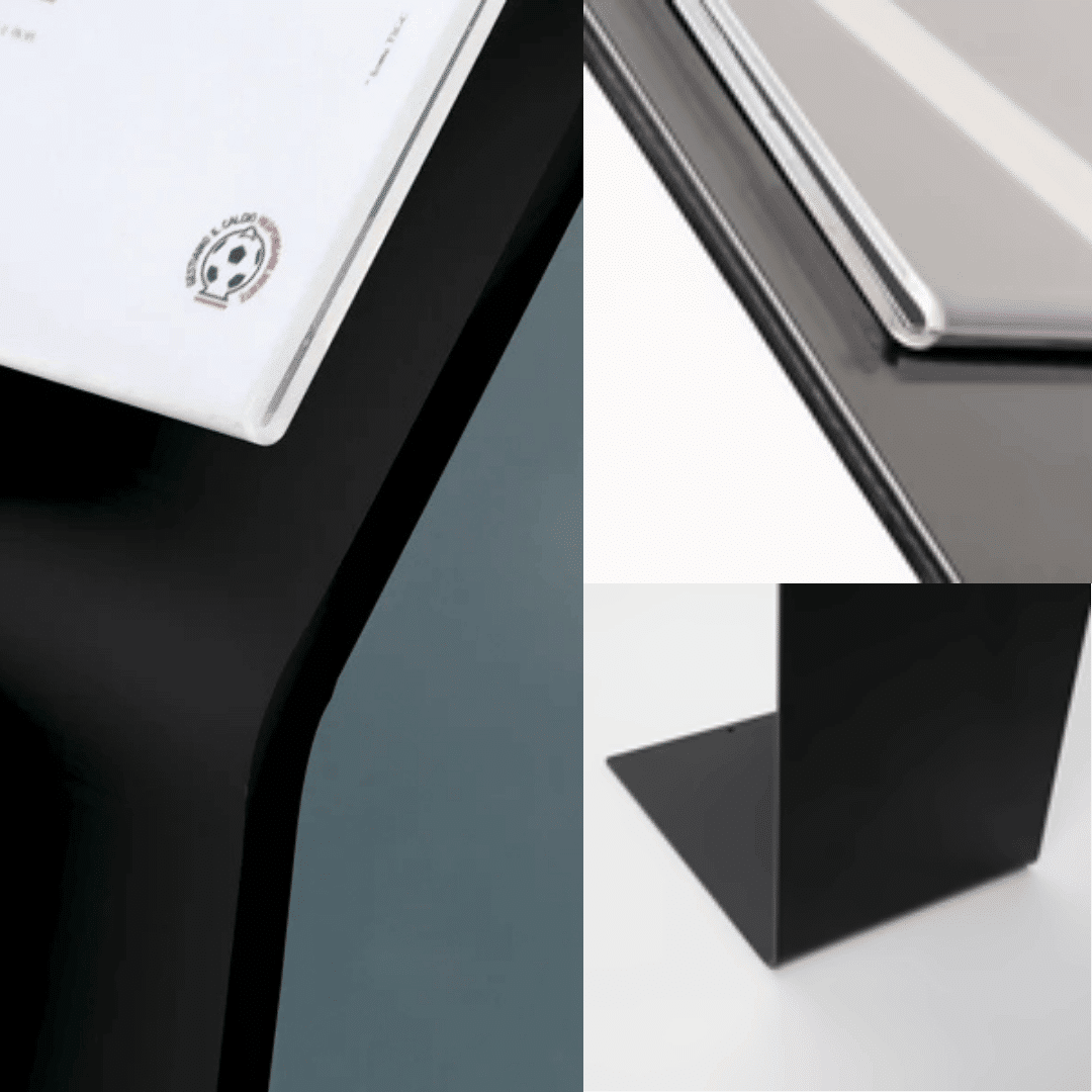 Il leggio in metallo verniciato nero disponibile a noleggio presso Noleggiando.com rappresenta una soluzione professionale e versatile per chi necessita di un supporto espositivo elegante e funzionale per eventi, fiere, congressi o comunicazioni aziendali nelle città di Torino e Milano. La struttura portante è realizzata interamente in metallo verniciato di colore nero, un materiale che garantisce non solo un’estetica raffinata e minimalista, ma anche una resistenza notevole nel tempo e un’ottima stabilità durante l’utilizzo in qualsiasi contesto espositivo. Il design autoportante con base a L assicura un equilibrio perfetto del leggio, eliminando il rischio di ribaltamenti accidentali anche in ambienti ad alto traffico pedonale, mentre lo spessore della base di 4 mm conferisce alla struttura quella robustezza necessaria per sostenere materiali informativi senza alcuna oscillazione. Nella parte superiore del leggio è posizionata una pratica tasca in plexiglass trasparente formato A4, progettata per contenere avvisi, comunicazioni, menù, programmi evento o qualsiasi tipo di segnaletica che desideri esporre con chiarezza e professionalità ai tuoi ospiti o clienti.