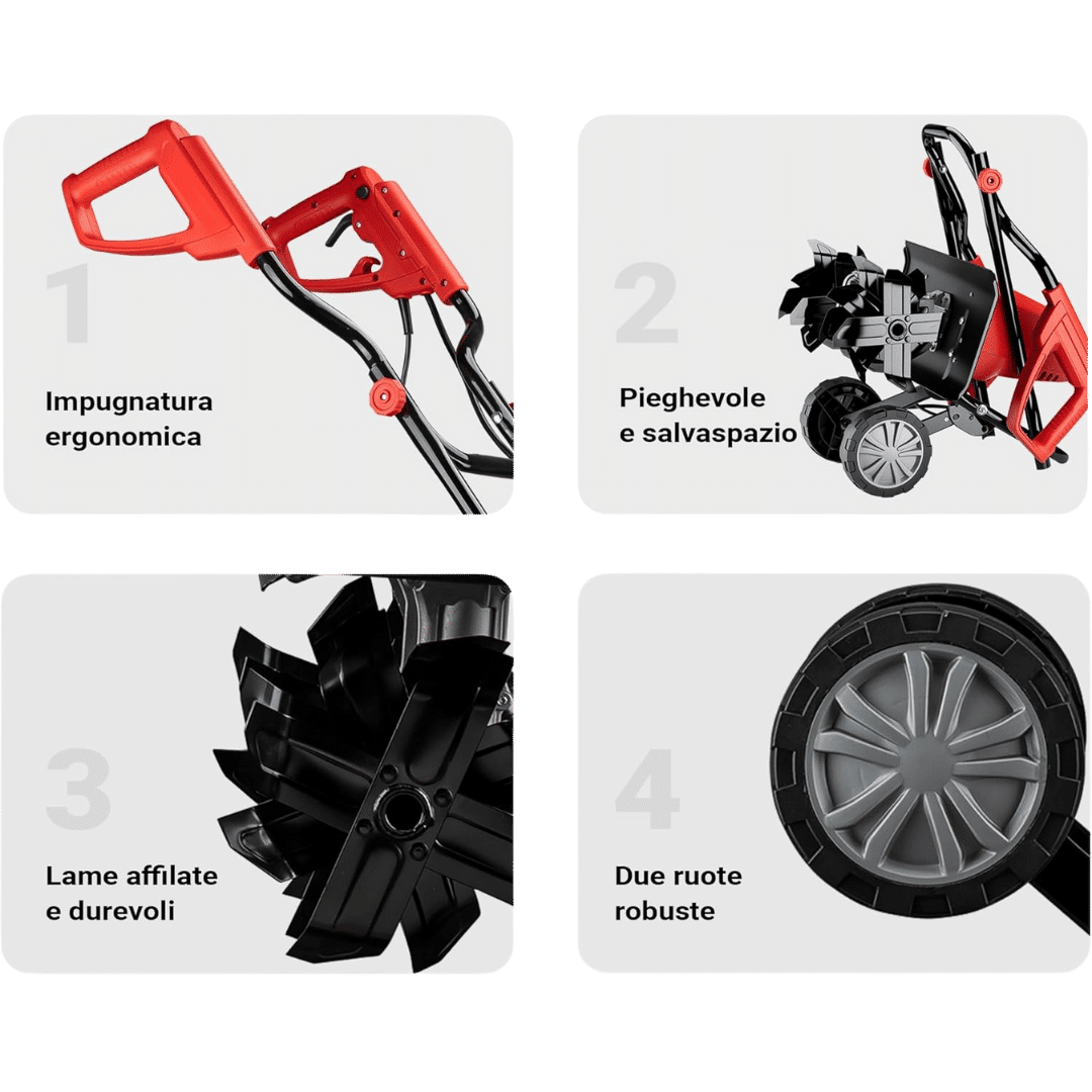 La motozappa elettrica disponibile per il noleggio a Torino e Milano presso Noleggiando.com rappresenta la soluzione ideale per chi necessita di uno strumento professionale per la lavorazione del terreno senza dover affrontare l’acquisto di un’attrezzatura costosa. Questo modello compatto è dotato di un motore elettrico da 1500W che garantisce prestazioni eccellenti per la fresatura di orti, giardini e aiuole di piccole e medie dimensioni. La velocità di rotazione di 400 giri al minuto assicura una lavorazione efficace del suolo, permettendo di sminuzzare zolle compatte e preparare il terreno in modo ottimale per la semina. Il sistema di 24 lame suddivise in 6 gruppi da 4 consente una larghezza di lavoro di 400 mm e una profondità massima di scavo di 220 mm, parametri che rendono questa elettrozappa particolarmente versatile per molteplici applicazioni agricole e hobbistiche. Le frese con diametro di 205 mm sono realizzate per penetrare efficacemente anche in terreni precedentemente non lavorati, garantendo risultati professionali in tempi ridotti.