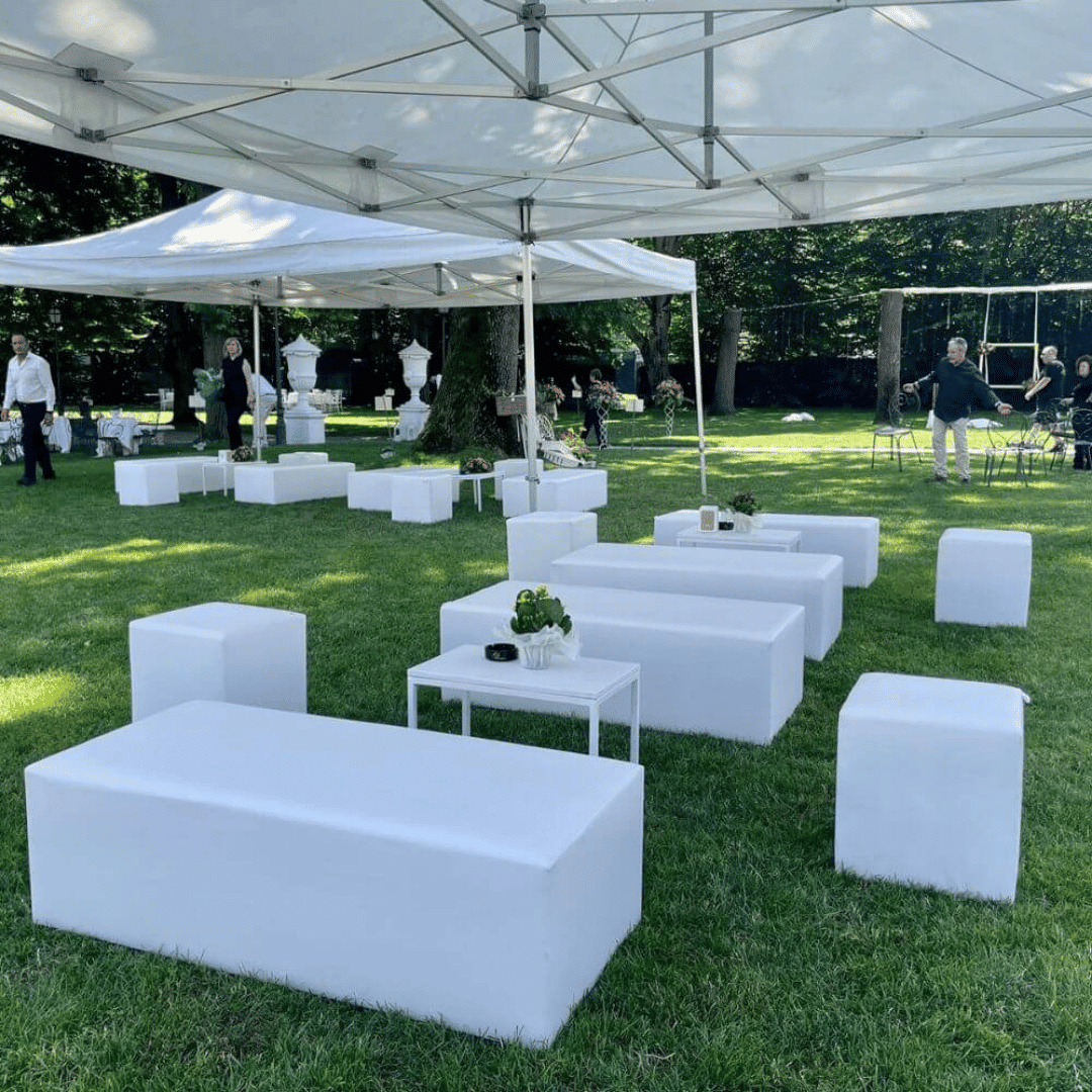 Il noleggio di pouf in ecopelle nera rappresenta una scelta sofisticata e funzionale per elevare l’atmosfera di qualsiasi evento o cerimonia. Realizzato in ecopelle nautica ignifuga, questo arredo non solo garantisce sicurezza ma offre anche una resistenza superiore all’usura, rendendolo ideale per l’utilizzo intensivo durante feste e ricevimenti. Le sue dimensioni compatte di 45 cm x 45 cm x 40 cm lo rendono versatile e adatto a spazi di diverse dimensioni, permettendo una disposizione flessibile che si adatta perfettamente alle esigenze specifiche di ogni allestimento. Il design elegante e minimalista del pouf nero si integra armoniosamente con svariati stili decorativi, dal moderno al classico, aggiungendo un tocco di raffinatezza senza mai risultare invadente.