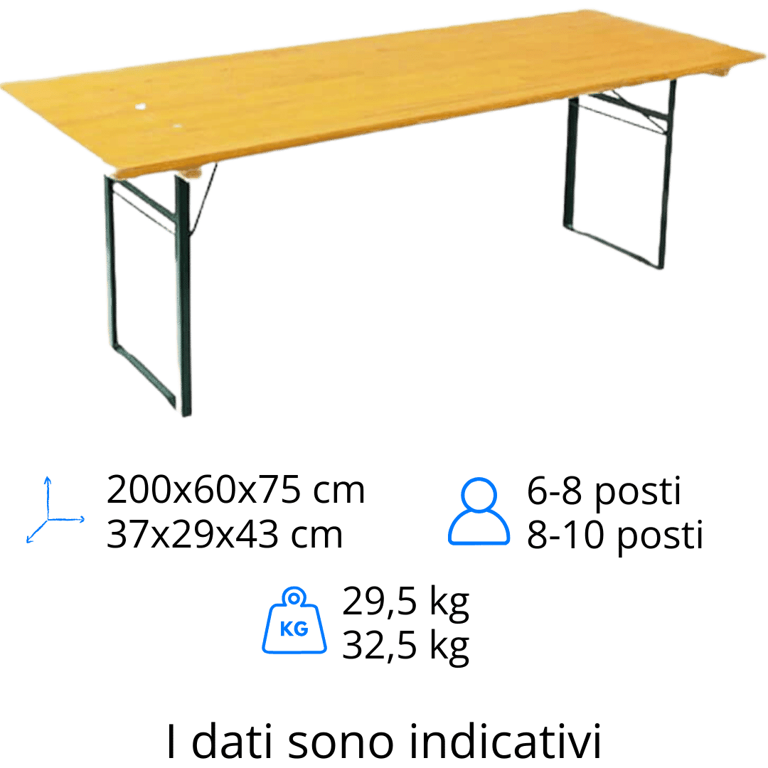 Il tavolo da birreria da 220×80 cm disponibile a noleggio presso Noleggiando.com rappresenta la soluzione ideale per chi necessita di un piano d’appoggio robusto e capiente, realizzato interamente in legno di abete di alta qualità che garantisce resistenza e un’estetica rustica perfetta per qualsiasi tipologia di evento. Con una lunghezza di 200 cm, una profondità di 60 cm e un’altezza standard di 75 cm, questo tavolo offre una superficie generosa in grado di ospitare comodamente fino a 8-10 persone sedute, rendendolo particolarmente adatto per banchetti, cene conviviali e raduni dove lo spazio a disposizione per ogni commensale risulta fondamentale. Il peso di 29,5 kg assicura una stabilità eccellente durante l’utilizzo, evitando oscillazioni o movimenti indesiderati anche quando il tavolo viene sollecitato con stoviglie, bevande e pietanze, mentre la struttura pieghevole consente un trasporto agevole e uno stoccaggio ottimizzato sia prima che dopo l’evento, permettendoti di gestire la logistica senza difficoltà.
